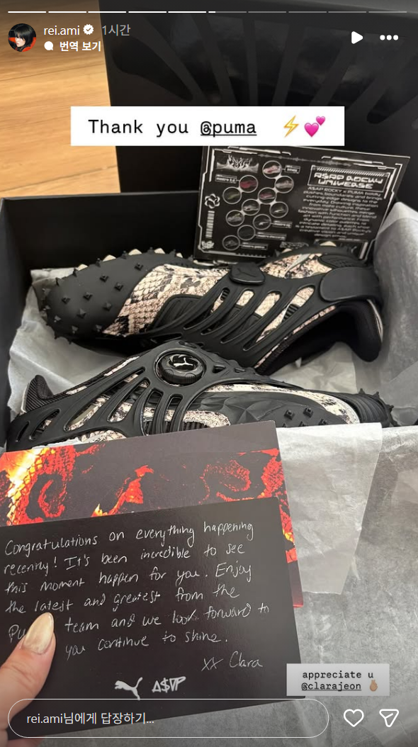 레이 아미는 퓨마 운동화 및 스포츠웨어 등을 선물받았는데 "최근 일어나고 있는 모든 일에 축하드려요! 이 순간이 당신에게 일어나는 것을 보는 것이 정말 멋졌어요. 퓨마 팀의 최신 제품을 즐기시고, 계속해서 빛나는 모습을 기대할게요."라고 적혀 있었습니다.