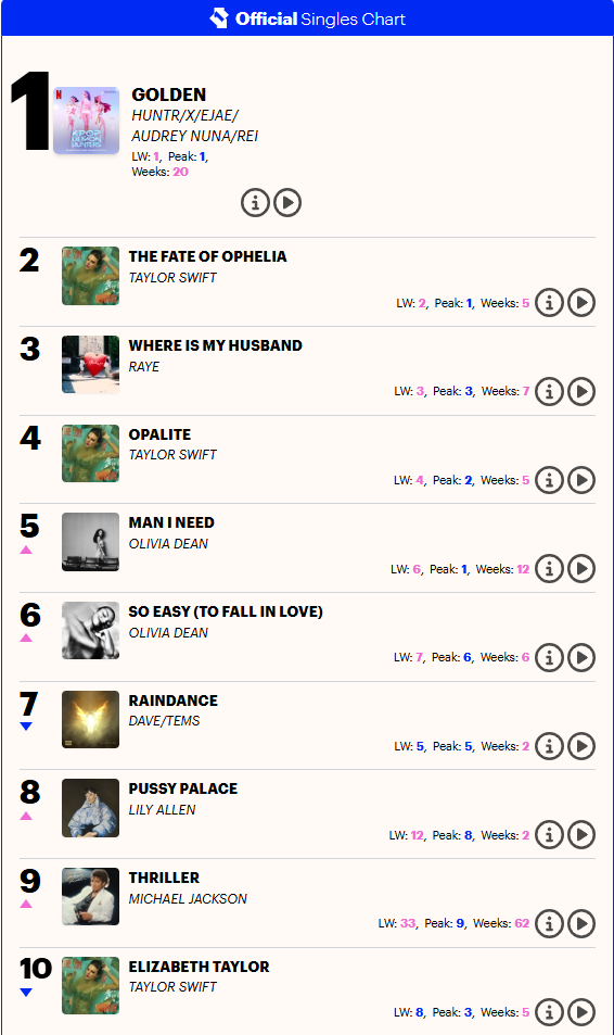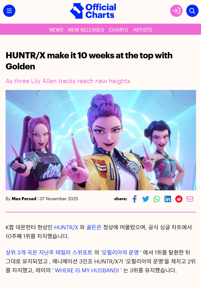 '케데헌'의 '골든(GOLDEN)'이 빌보드와 함께 세계 양대 차트로 불리는 영국 오피셜 싱글 차트에서 통산 10주 1위에 올랐습니다.