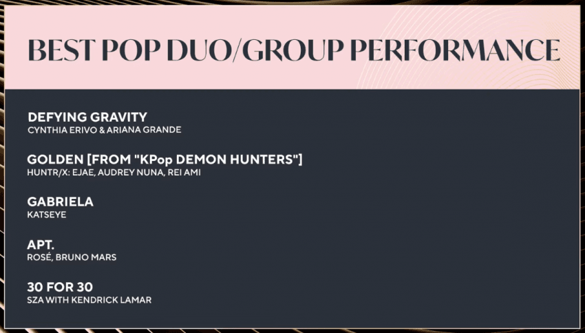 블랙핑크 멤버 로제 또한 히트곡 '아파트'(APT.)로 '송 오브 더 이어'와 '레코드 오브 더 이어(Record of the Year)'를 포함한 총 3개 부문 후보에 지명됐습니다.