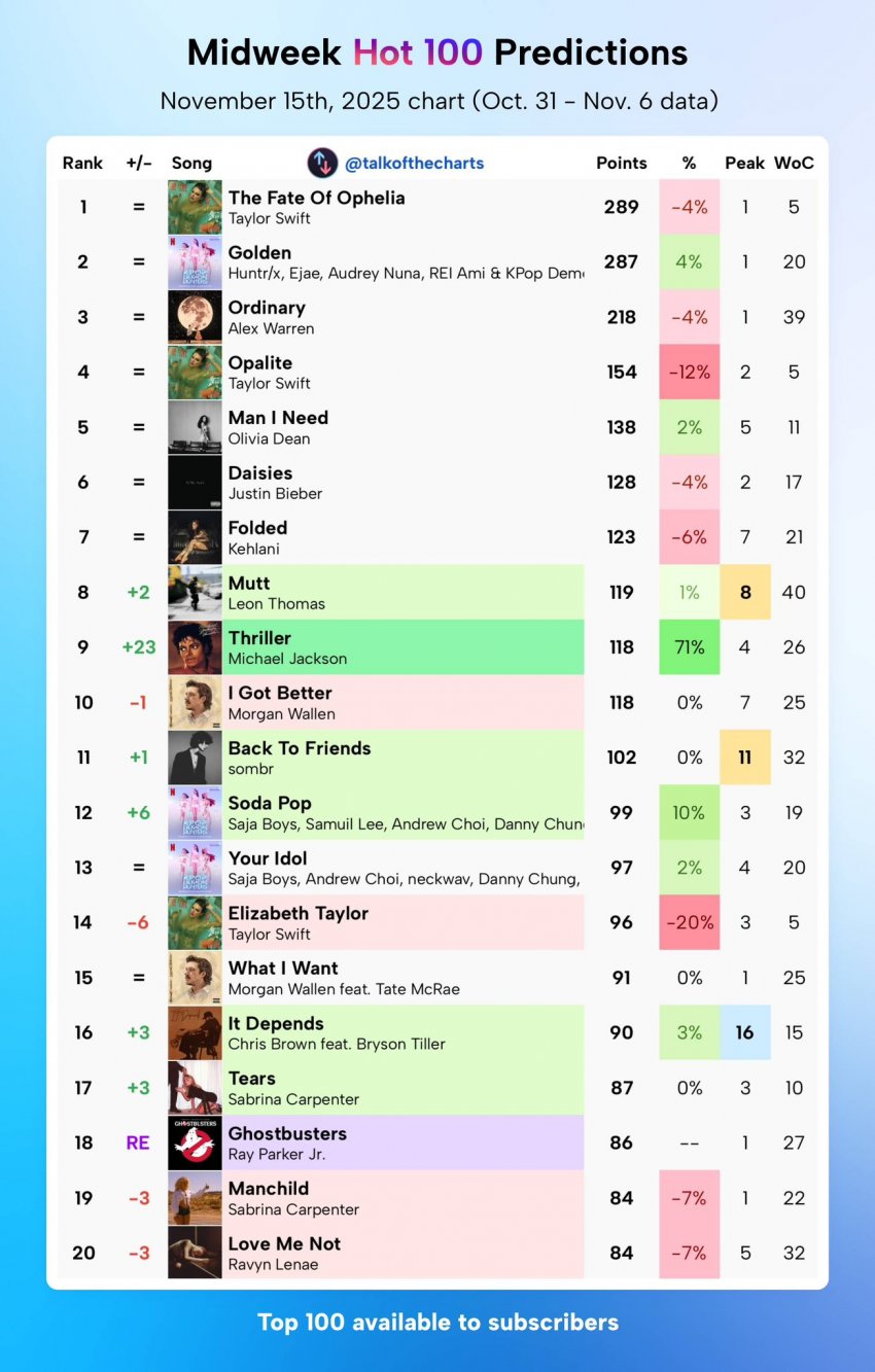 1위 테일러 스위프트의 '더 페이트 오브 오필리아'는 289점, 2위 헌트릭스(HUNTR/X)의 '골든'은 287점으로 단 2점 차이였습니다.