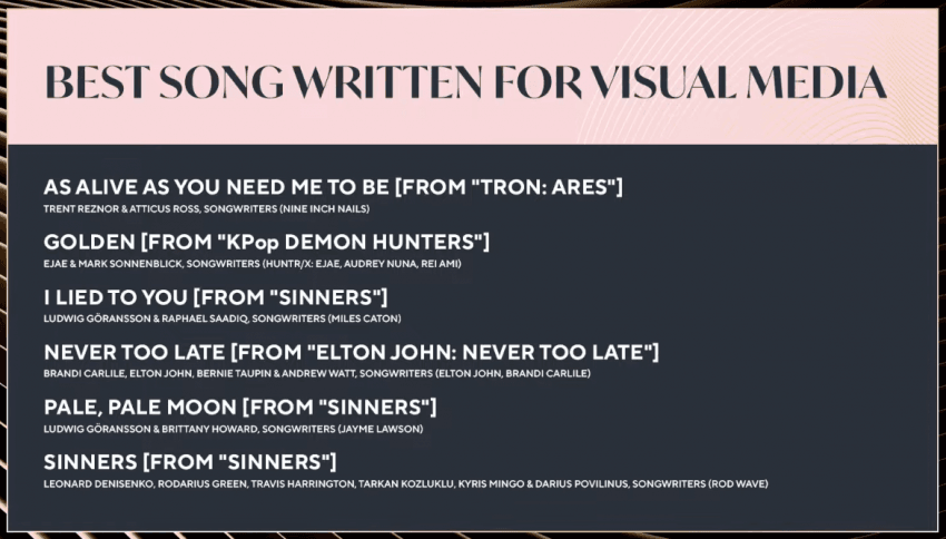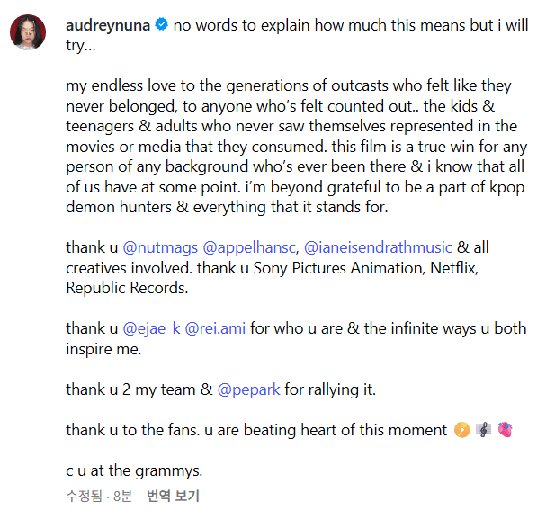 항상 무시당한다고 느꼈던 모든 이들에게, 그리고 자신이 보았던 영화나 미디어에서 자신의 모습을 한 번도 보지 못했던 아이들, 청소년, 성인들에게 끝없는 사랑을 전합니다. 이 영화는 그런 경험을 해 본 적이 있는 모든 배경의 사람들에게 진정한 승리이며, 우리 모두가 어느 시점에는 그런 경험을 했을 거라고 알고 있습니다. 저는 케데헌'의 일부가 된 것, 그리고 이 영화가 상징하는 모든 것에 대해 한없이 감사드립니다. 매기 강 감독님, 크리스 감독님, 이안 아이젠드라스, 그리고 참여한 모든 크리에이티브 팀에게 감사드립니다. 소니픽쳐스 애니메이션, 넷플릭스, 리퍼블릭 레코드에게도 감사드립니다. 이재와 레이아미, 당신들이 누구인지, 그리고 저에게 끝없이 영감을 주는 당신들의 방식에 감사드립니다. 저의 팀과 매니저에게도 감사를 전합니다. 함께 힘을 모아주셔서 감사합니다. 그리고 팬 여러분께 감사드립니다. 여러분이 바로 이 순간의 뛰는 심장입니다. 그래미에서 만나요."라고 장문의 감사 인사를 했습니다.