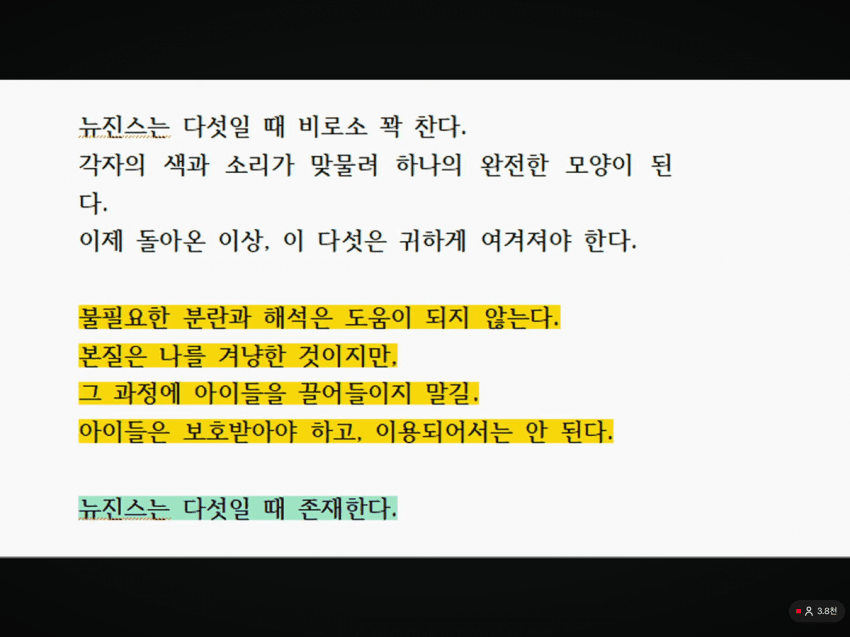 이어 “뉴진스는 다섯일 때 비로소 꽉 찬다. 각자의 색과 소리가 맞물려 하나의 완전한 모양이 된다”며 “이제 돌아온 이상, 이 다섯은 귀하게 여겨져야 한다. 불필요한 분란과 해석은 도움이 되지 않는다”고 덧붙였습니다.