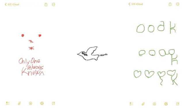 공개된 사진 속에는 'only one always known'(온리 원 올웨이즈 노운), '오케이 레코즈(ooak records)'라는 문구가 담긴 스케치가 포함돼 있으며 해당 스케치들은 브랜드 로고 후보로 추정됐습니다.