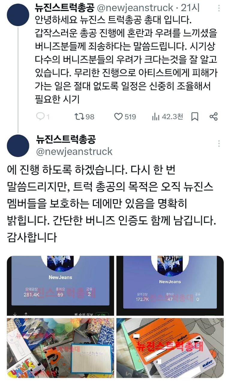 트럭총공 계정은 "갑작스러운 총공 진행에 혼란과 우려를 느끼셨을 버니즈분들께 죄송하다는 말씀드립니다. 시기상 다수의 버니즈분들의 우려가 크다는것을 잘 알고 있습니다. 무리한 진행으로 아티스트에게 피해가 가는 일은 절대 없도록 일정은 신중히 조율해서 필요한 시기에 진행 하도록 하겠습니다. 다시 한 번 말씀드리지만, 트럭 총공의 목적은 오직 뉴진스 멤버들을 보호하는 데에만 있음을 명확히 밝힙니다"라고 중단 보류 이유를 전했습니다.