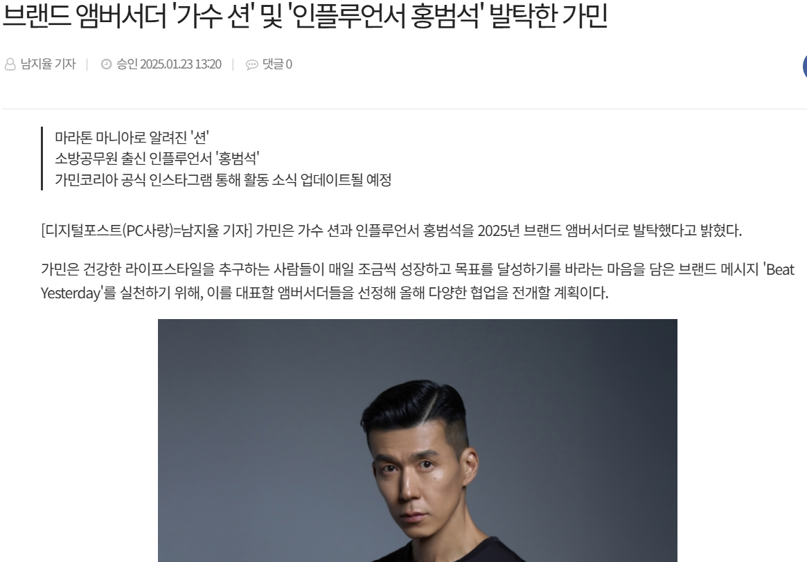 가민은 올해 1월에 가수 션과 인플루언서 홍범석을 2025년 브랜드 앰버서더로 발탁했다고 밝혔습니다.