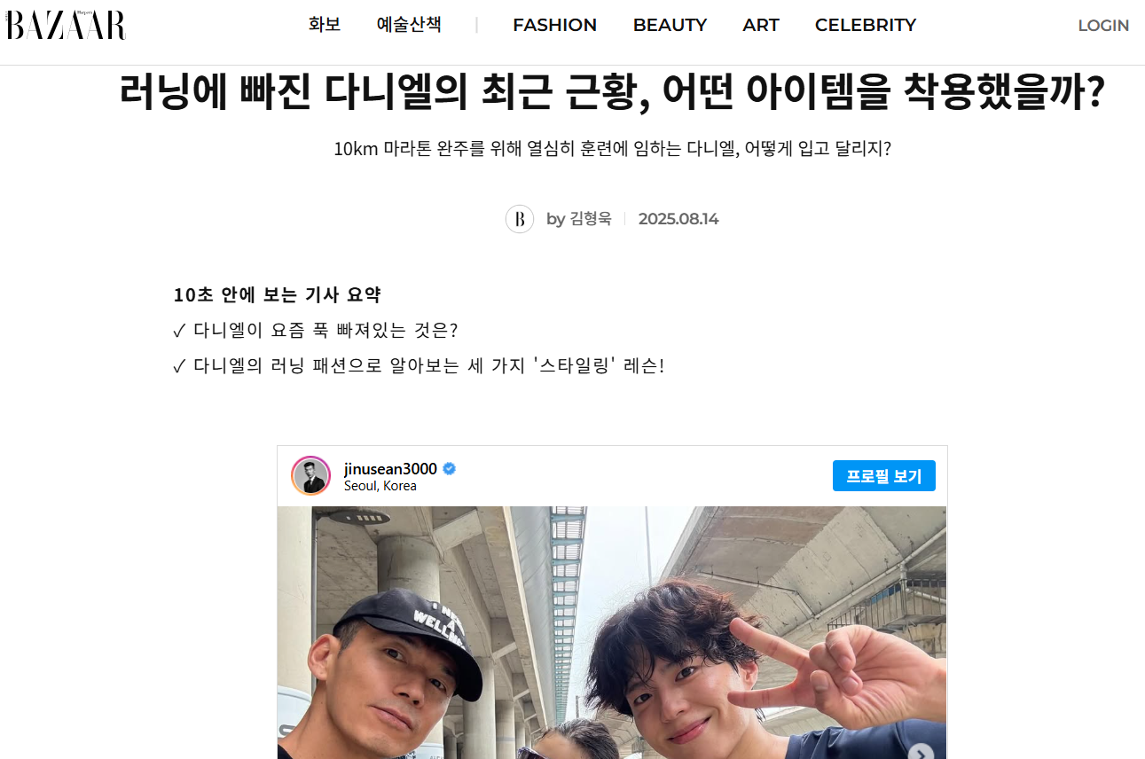 그리고 '바자'는 "다니엘의 근황이 궁금하다면? 션의 인스타그램을 확인하면 된다! 다니엘은 최근 첫 10km 마라톤 대회를 앞두고 션, 박보검 등과 함께 마라톤 훈련에 몰두하고 있다. 특히 션은 맞춤형 러닝 레슨과 세심한 조언으로 다니엘의 첫 완주를 돕고 있다고. 훈련만큼이나 눈길을 끄는 건 다니엘의 ‘러닝 패션’이다. 다니엘의 러닝 패션으로 알아보는 3가지 '초보 러너 패션 레슨'."라고 기사를 이어갔습니다.