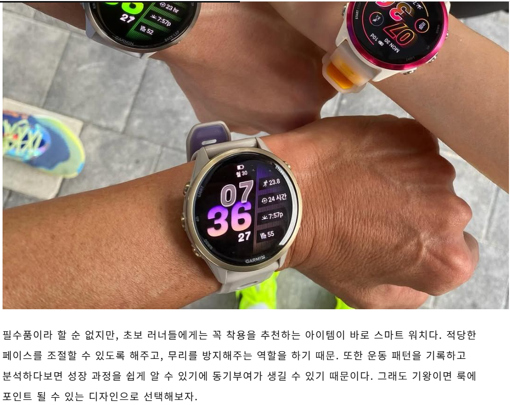'바자'는 "필수품이라 할 순 없지만, 초보 러너들에게는 꼭 착용을 추천하는 아이템이 바로 스마트 워치다. 적당한 페이스를 조절할 수 있도록 해주고, 무리를 방지해주는 역할을 하기 때문. 또한 운동 패턴을 기록하고 분석하다보면 성장 과정을 쉽게 알 수 있기에 동기부여가 생길 수 있기 때문이다. 그래도 기왕이면 룩에 포인트 될 수 있는 디자인으로 선택해보자."라고 소개했습니다.
