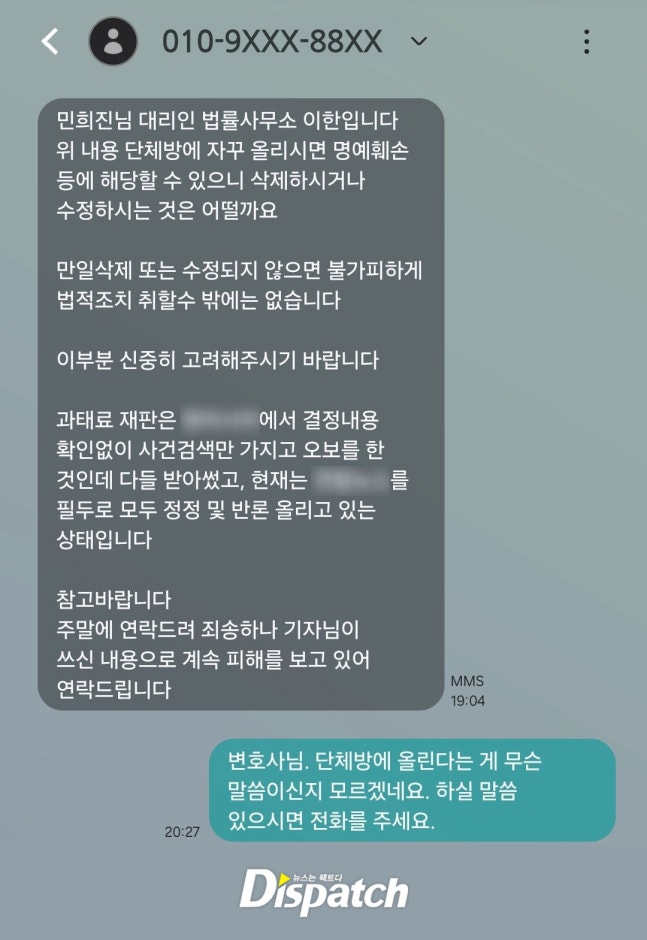 디스패치가 11월24일 보도한 ‘민희진, 직괴 판결문과 유령 변호사’란 기사에 언급된 휴대전화 네 자리와 ‘동일’한 인물입니다.
