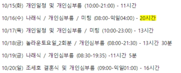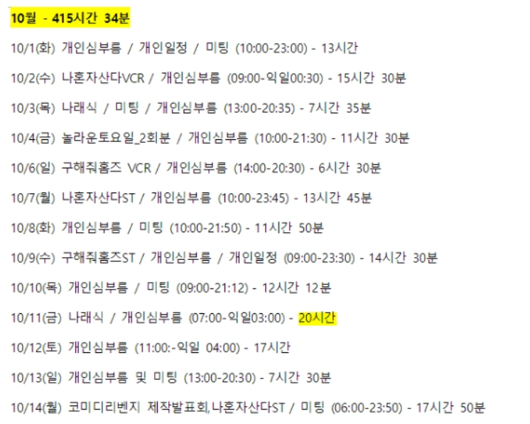 심지어 10월 11일은 나래식, 개인 심부름이 아침 7시부터 다음날 새벽 3시까지 무려 20시간 동안 발생했습니다.