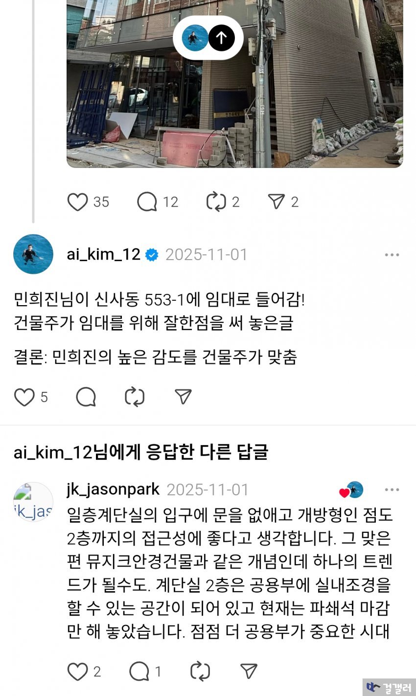 이어 "민희진님이 신사동 건물에 임대로 들어감. 건물주가 임대를 위한 잘한 점을 써놓은 글. 결론, 민희진의 높은 감도를 건물주가 맞춤"이러고 강조했습니다.