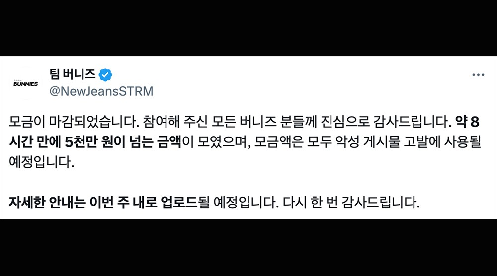 운영자는 지난해 10월 '뉴진스 관련 악성 게시물을 고발하겠다'며 SNS를 통해 기부 계좌를 공개했고, 5000만 원이 넘는 기부금을 모았습니다.