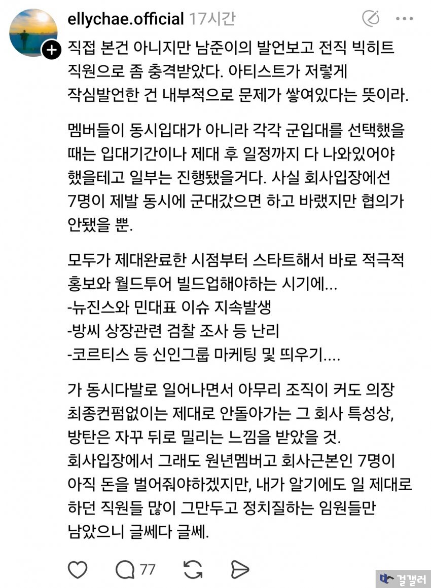 엘리채는 마지막으로 "회사 입장에서 그래도 원년 멤버고 회사 근본인 7명이 아직 돈을 벌어줘야 하겠지만, 내가 알기에도 일 제대로 하던 직원들 많이 그만 두고 정치질하는 임원들만 남았으니 글쎄다 글쎄"라고 하이브에 부정적인 평가를 숨기지 않았습니다.