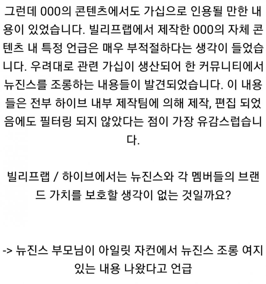 민지 엄마는 탄원서에서 "아일릿의 콘텐츠에서도 가십으로 인용될 만한 내용이 있었습니다. 빌리프랩에서 제작한 아일릿의 자체 콘텐츠 내 특정 언급은 매우 부적절하다는 생각이 들었습니다. 우려대로 관련 가십이 생산되어 한 커뮤니티에서 뉴진스를 조롱하는 내용들이 발견되었습니다. 이 내용들은 전부 하이브 내부 제작팀에 의해 제작 편집되었음에도 필터링 되지 않았다는 점이 가장 유감스럽습니다"라고 적혀 있습니다.