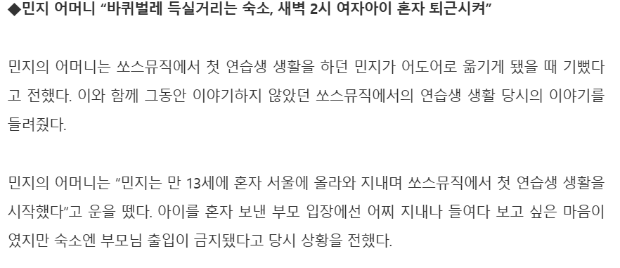 또 민지 엄마는 작년 7월 스포츠월드와의 인터뷰에서 "바퀴벌레 득실거리는 숙소에서 생활했다" "학업 포기 종용했다" 등 하이브를 비난하며 "민희진 대표와 끝까지 함께하겠다"는 의지를 밝히기도 했습니다.