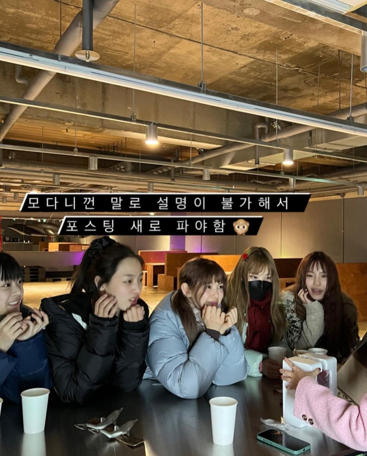 사진에서 5명 멤버들은 민희진을 향해 애정어린 시선을 보내고 있었습니다.