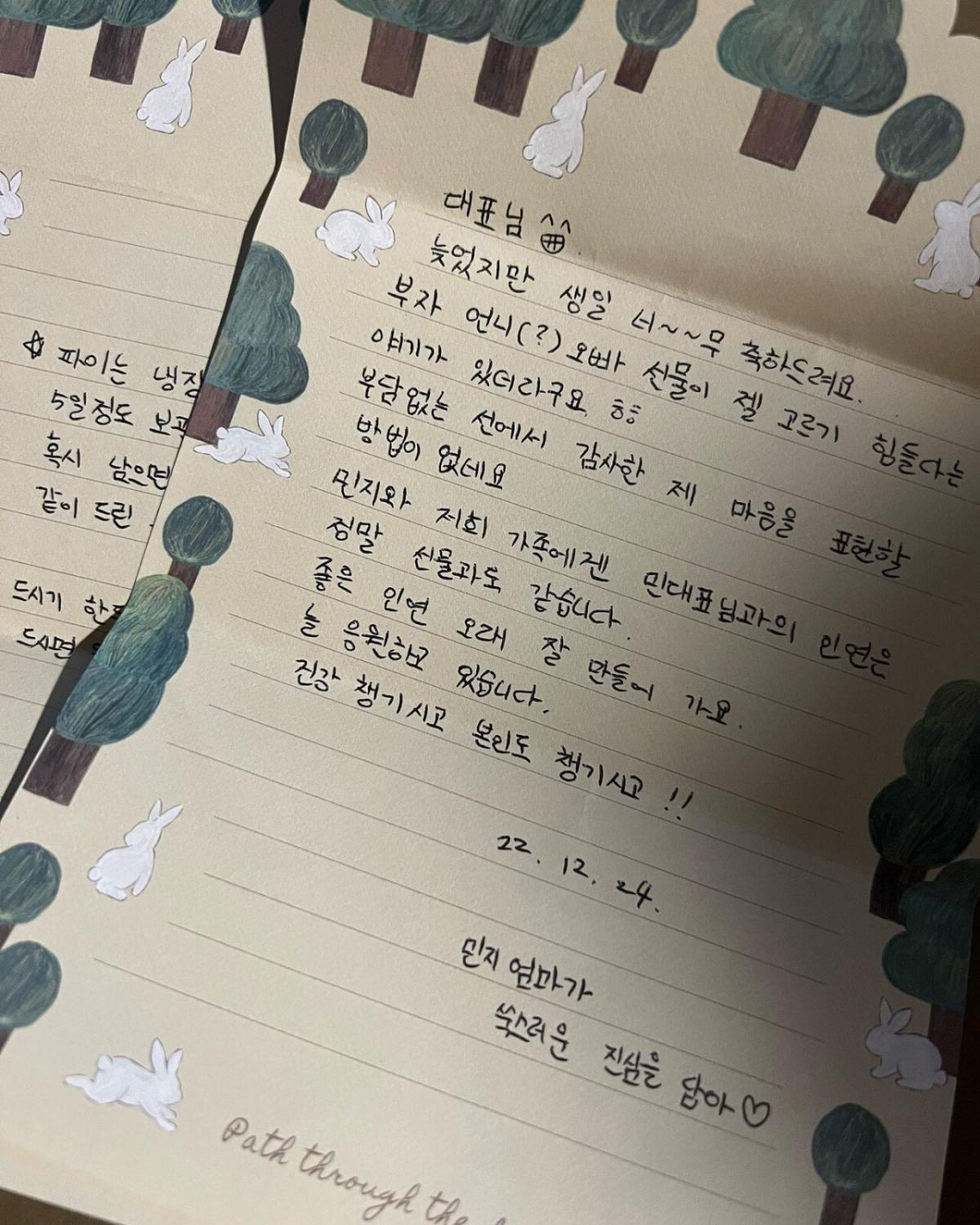 민지 엄마가 보낸 손편지 내용을 보면 "대표님 늦었지만 생일 너무 축하드려요. 부자 언니 오빠 선물이 젤 고르기 힘들다는 얘기가 있더라구요. 부담없는 선에서 감사한 마음을 표현할 방법이 없네요. 민지와 저희 가족에겐 민 대표님과의 인연은 선물과도 같습니다. 좋은 인연 오래 잘 만들어가요. 늘 응원하고 있습니다. 건강 챙기시고 본인도 챙기시고! 민지 엄마가 쑥스러운 진심을 담아"라고 적혀 있습니다.