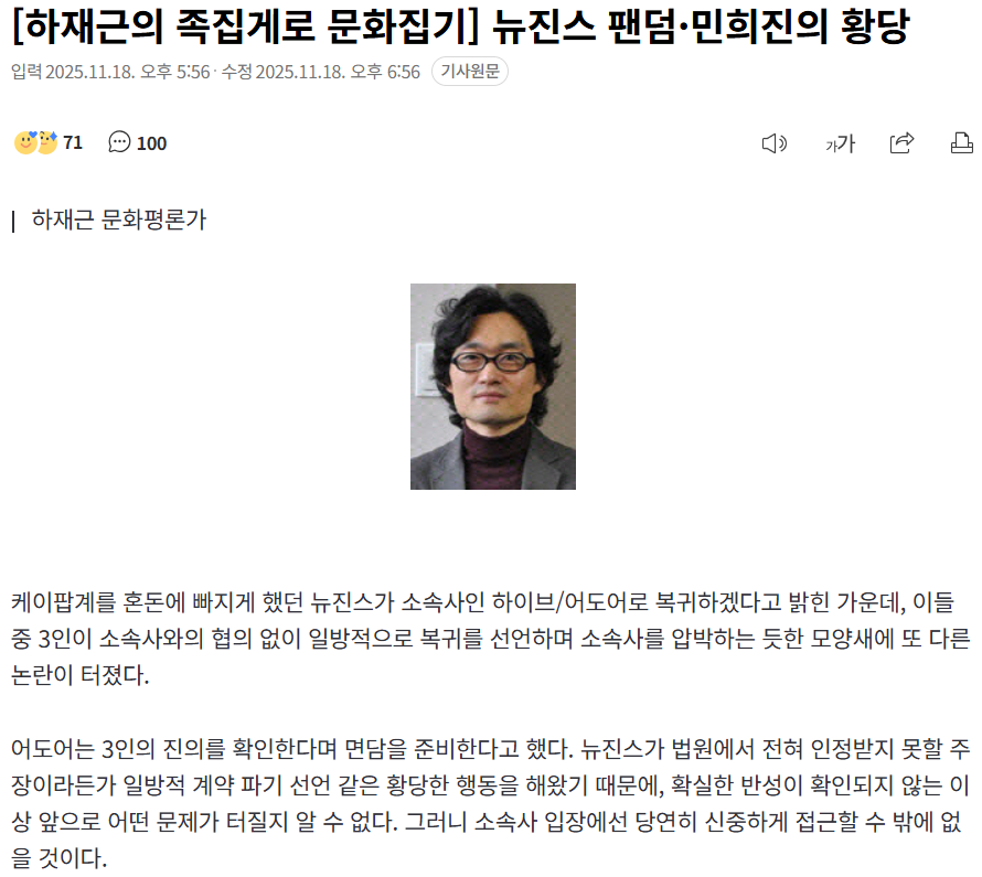 뉴진스 분쟁이 K팝 산업의 근본적 긴장을 드러냈다는 것이다. 그것이 ‘엔터테인먼트 대기업이 주도하는 하향식 시스템과 예술적 혁신 사이의 충돌’이라고 했다. 그러면서 이 사건이 K팝의 미래를 가늠하는 시금석이 될 거라고 했다. 앞으로 K팝 산업이 미학과 혁신을 중시할지, 아니면 규모와 통제만을 추구할지를 보여준다는 것이다.