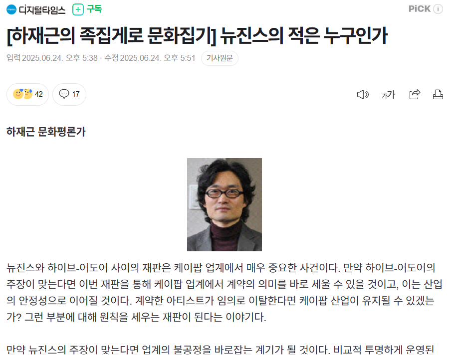 뉴진스가 한국 시스템을 비판하고 나서자 서구의 K팝 비판자들은 단비를 만난 느낌이었을 것이라는 얘기입니다.