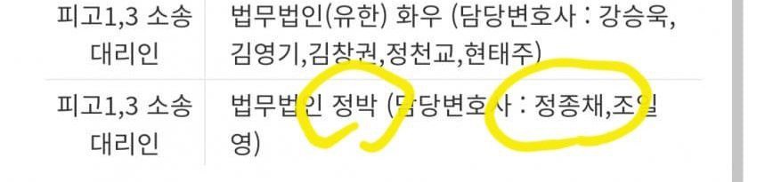 법무법인 '정박'의 정종채 변호사와 조일영 변호사가 담당 변호사입니다.