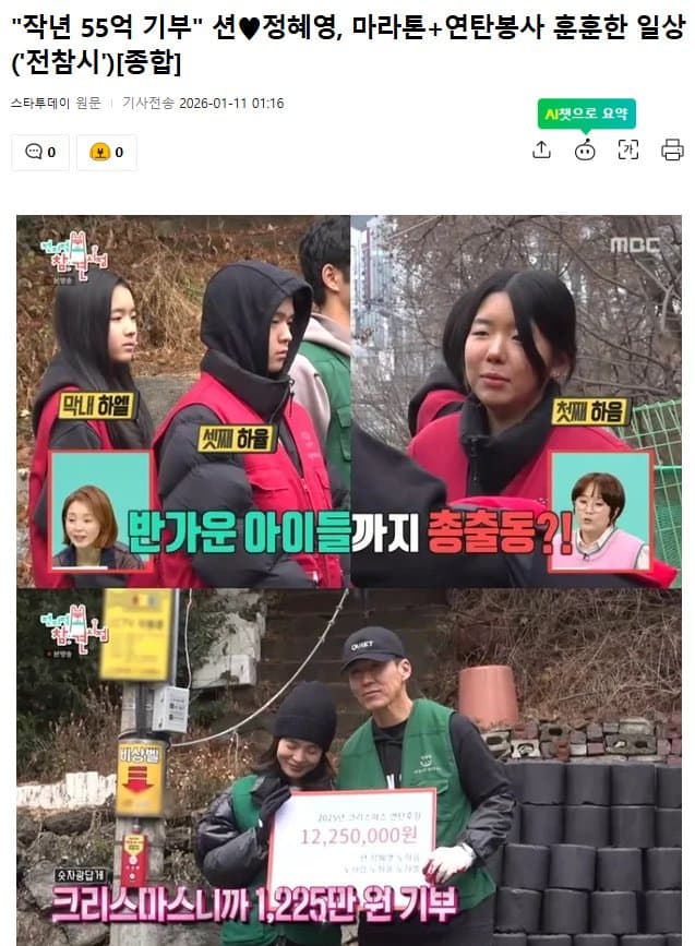 또 방송에서는 크리스마스 이브 12월 24일에 션과 아내 정혜영 그리고 세 자녀 등 가족이 전부 나와 연탄 봉사를 했습니다.