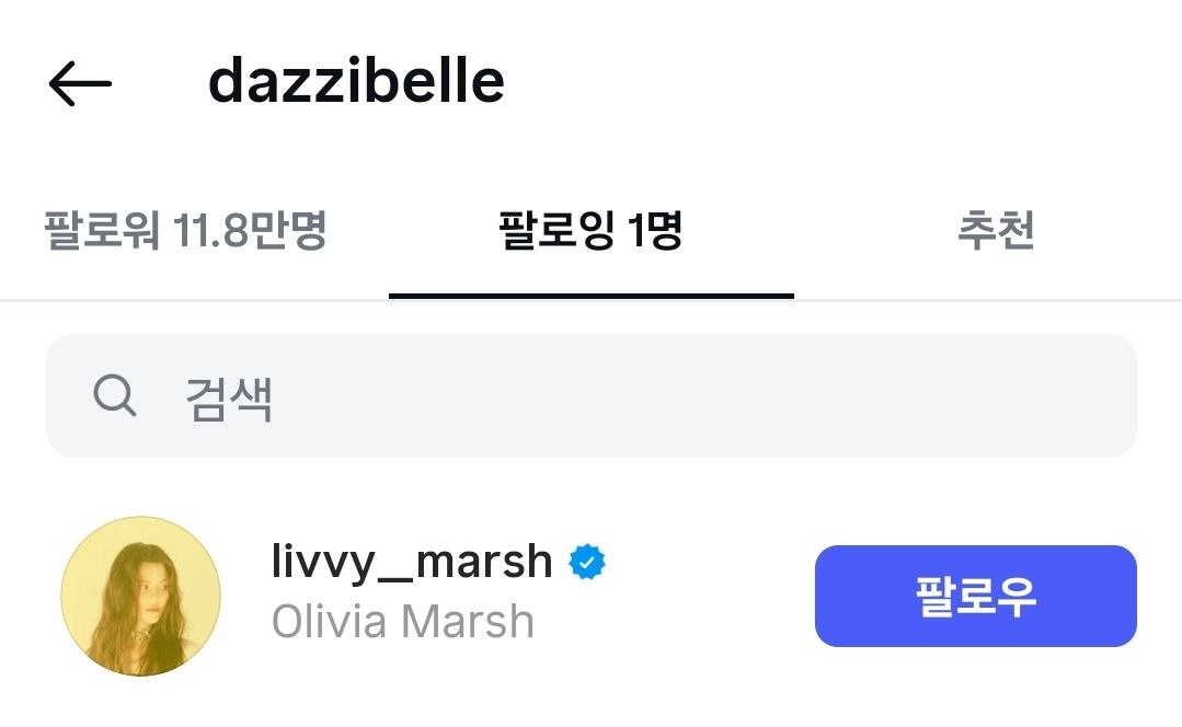 '다지벨(Dazzibelle)' 계정은 다니엘 언니 올리비아 마쉬의 인스타그램 계정 하나만 팔로우하고 있었으며, 올리비아 마쉬 계정 또한 '다지벨' 계정을 맞팔로우하고 있었습니다.
