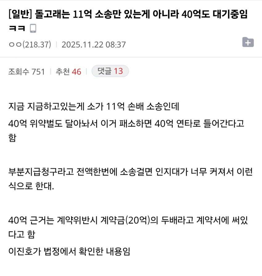 한 네티즌은 "부분지급청구라고 전액 한번에 소송 걸면 인지대가 너무 커져서 단계적으로 소송한다"면서 "40억원의 근거는 계약 위반 시 계약금 20억원의 2배라고 계약서에 써있다고 한다"라고 전했습니다.