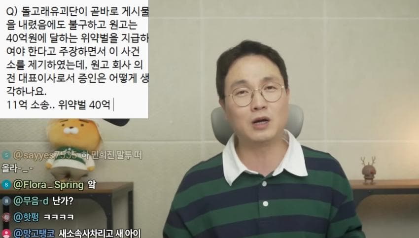 당시 이진호유튜버는 법정에서 "돌고래유괴단이 곧바로 게시물을 내렸음에도 불구하고 원고는 40억원에 달하는 위약벌을 지급하여야 한다고 주장하면서 이 사건 소를 제기하였는데, 원고 회사의 전 대표이사로서 증인은 어떻게 생각하나요?"라는 판사의 질문이 나왔다고 공개했습니다.