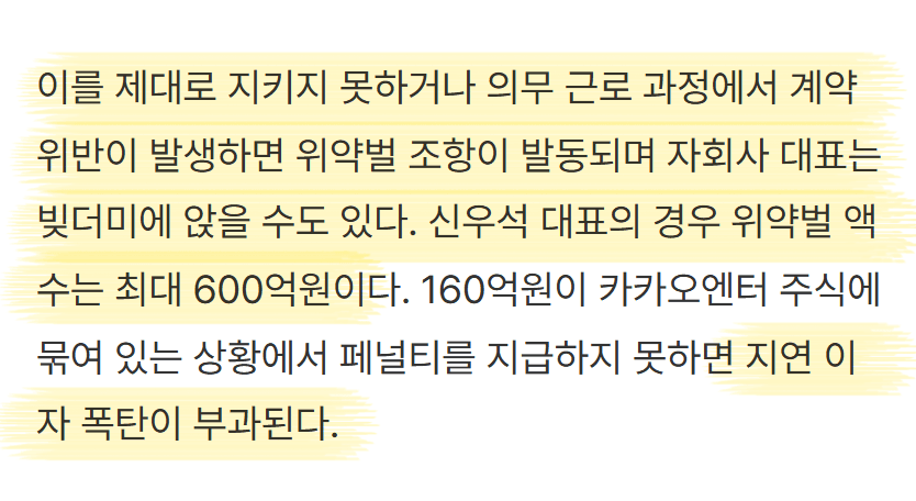 비슷하게도 카카오엔터와 신우석 사이의 주주간 계약에도 5년 영업이익 180억원 달성 못하면 그 차액을 한 달 내에 상환해야 할 뿐 아니라, "의무 근로 과정에서 계약 위반이 발생하면 위약벌" 을 맞는다는 조항이 있습니다.