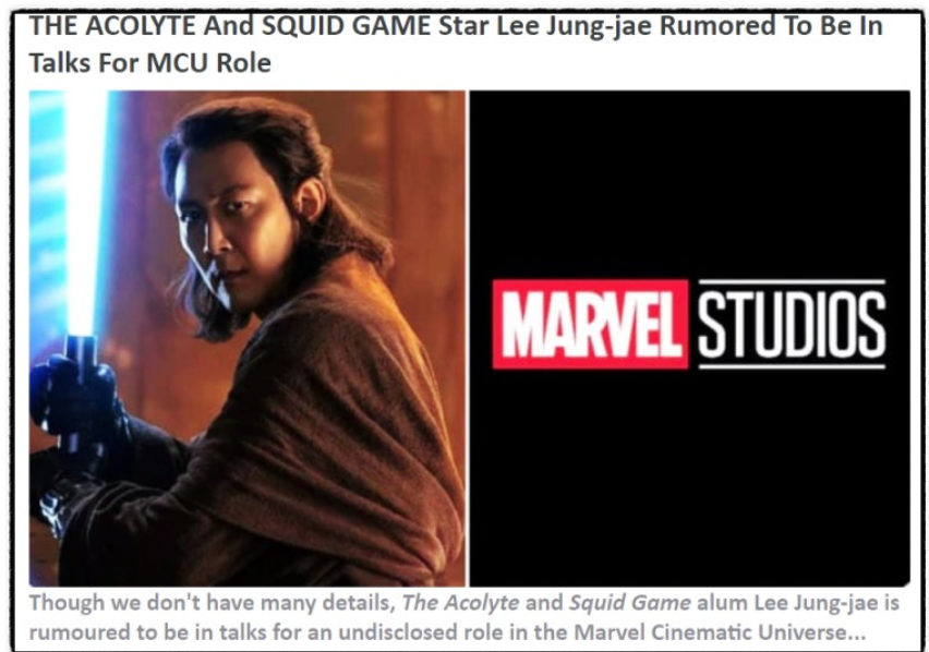 이정재 배우가 마블 시네마틱 유니버스(Marvel Cinematic Universe)에 출연 및 역할을 놓고 협상 중이라는 소문이 해외 언론에 보도됐습니다. 마블 시네마틱 유니버스 MCU는 아이언맨, 어벤져스, 스파이더맨 등 시리즈로 유명합니다. 이정재는 이미 넥플릭스 '오징어게임'은 물론 디즈니+의 스타워즈 '애콜라이트'에서 주연 배우로서 성공적인 결과를 선보인 바 있어 MCU 관련 뉴스에 전세계적 관심이 집중될 수 밖에 없습니다. 자세한 이야기, 지금 시작합니다. 코믹북무비닷컴(ComicBookMovie.com)은 최근 "애콜라이트와 오징어 게임 스타 이정재가 MCU 역할을 놓고 협상 중이라는 소문이 돌고 있다(THE ACOLYTE And SQUID GAME Star Lee Jung-jae Ru..